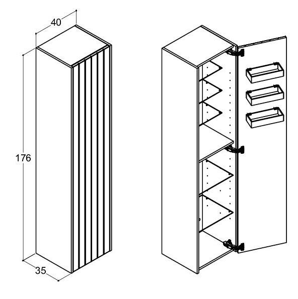 Dansani Luna Vintage 40 højskab B m/låge - Højrehængslet - Hvid mat Skab en indbydende atmosfære i dit badeværelse med dette højskab med rillede front i version B. Dette 176 cm høje skab har en træhylde, tre forkortede glashylder, tre træbakker på lågen og to glashylder. Den rummelige opbevaringsplads sikrer, at du har alt inden for rækkevidde, mens de rillede detaljer tilføjer et klassisk touch til indretningen. Højskabet er perfekt til opbevaring af toiletartikler, håndklæder og andre nødvendigheder, og dets stilfulde design gør det til en æstetisk del af dit badeværelse. Specifikationer: