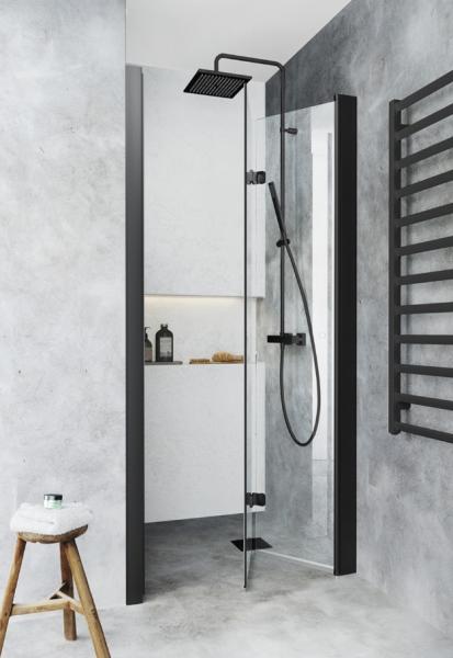 Foldbar brusedør med klart glas og profiler og greb i matsort, der er tilpasset nicheåbning og gør det muligt at skabe en smart bruseløsning til det lille badeværelse. Foldedøren kan åbnes uden at tage plads og skaber en praktisk bruseløsning, selvom toilet- eller badeværelsesmøblet er placeret i nærheden af bruseren. Brusedøren er stabil med vægprofil og en separat profil til magnetlisten. Vægprofilerne kan monteres med skruer eller limbrikker. Den har en patenteret løsning til nem installation og justering, Hafas InstaQuick ™. Brusedøren har et løftehængsel, så den ikke rører gulvet ved åbning og er vendbar, så du kan vælge hvis den skal placeres til højre eller venstre. 6 mm hærdet sikkerhedsglas. Højde 2000 mm. Kan monteres med påbygningsrør, 35 mm. 22 mm slæbelister og magnetliste medfølger. Integreret håndtag. Specifikationer: