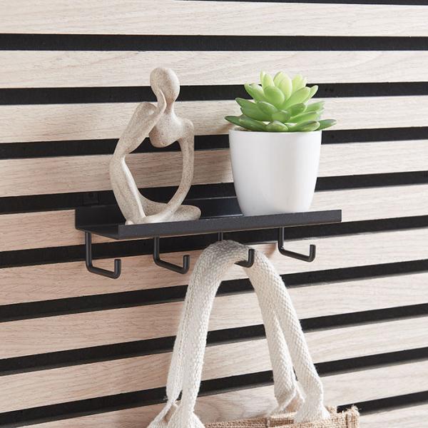 Hylde til akustikpanel inkl. 4 kroge Forvandl din opbevaringsplads med den elegante hylde med 4 kroge, perfekt til montering på akustikpaneler både lodret og vandret. Denne hylde i mat sort tilbyder en praktisk løsning til organisering af nøgler, tasker og små genstande. Med de medfølgende skruer er installationen enkel og hurtig, så du kan skabe orden i dit hjem uden besvær. Denne hylde tilføjer ikke blot et moderne og stilfuldt touch til dit rum, men er også den ideelle kombination af funktionalitet og design. Giv dit hjem et friskt og stilfuldt udtryk med denne alsidige hylde, der passer ind i enhver indretning og behov. Specifikationer: